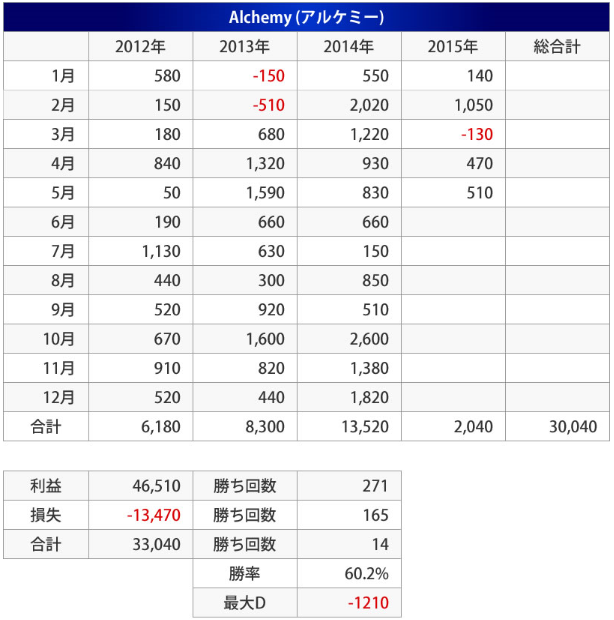 Alchemy(アルケミー)を使って投資をした詳細な結果が下記になります。ご覧のように3年以上プラス収支を継続しています。