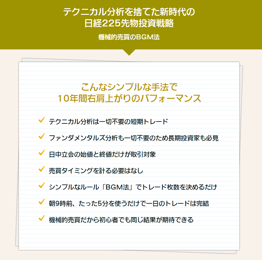 | 正式商品名称 | テクニカル分析を捨てた新時代の日経225先物戦略〜機械的売買のBGM法〜 |