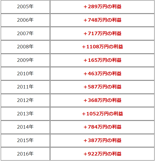 過去12年間の過去検証を含む成績は、毎年負けることなく最低でも年間165万円の利益を出し続けています。