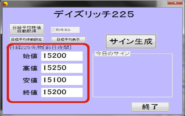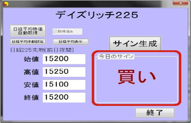 | 正式商品名称 | デイズリッチ225 日経225先物 日中寄引け版 サイン判定ソフト |