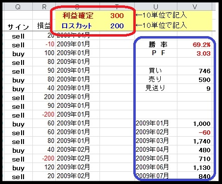 「利益確定」「ロスカット」の欄に数値を入れると、勝率、PF、月別利益、総合利益・・・を確認できますので、 利益確定/ロスカットを設定することでリスクを軽減することができます。