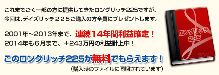 過去14年間連続で利益を出し続けている「ロングリッチ225」も特典として提供されます。