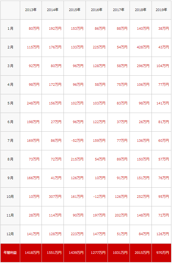 この7年間の月間平均利益は、ラージ1枚(資金72万円)の取引で、月間平均115万4900円の利益でした。
