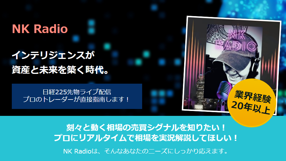 「NK Radio 日経225先物ライブ配信!」は、外資系証券会社で20年以上のトレーディング経験と実績を持つエヌケイ氏が、相場状況をライブで配信するサービスです。
