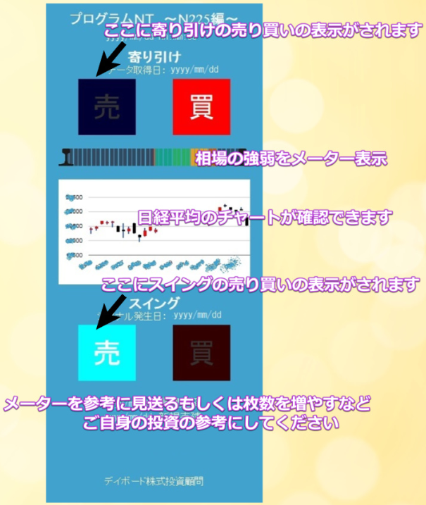 「日経225先物 寄り引け+スイングトレード プログラムNT 225編」は、『日中寄り引け』と『スイングトレード』の2つのサインを発信する月額サービスです。