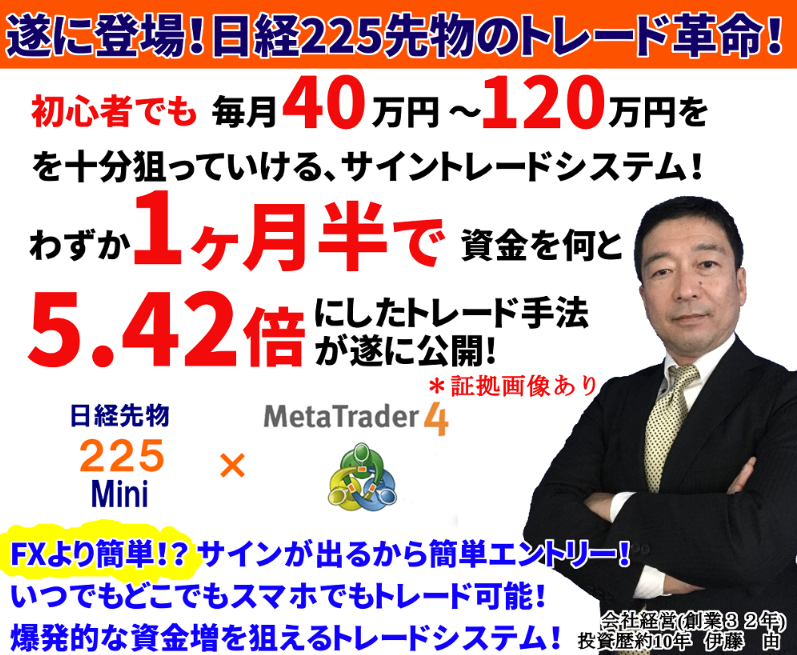 「スーパースキャルピング225」は、MT4(メタトレーダー)に日経225先物ミニのサインを生成させてトレードをするという新感覚のトレードシステムです。