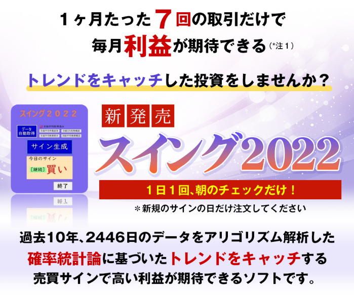 スイング2022は、確率統計論からアリゴリズム解析によって導き出された高い確率で利益が期待できるサインですので、投資で利益が出せていない人には重宝するのではないでしょうか。