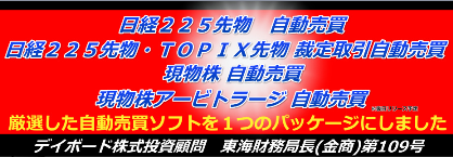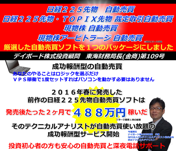 | 正式商品名称 | 成功報酬型自動売買 システムトレードオン 日経225先物両建て自動売買 現物株自動売買 |